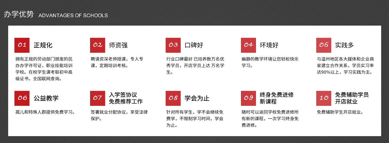 我校以培養(yǎng)實用型專業(yè)人才為目標(biāo),理論學(xué)習(xí)、操作訓(xùn)練與專業(yè)實踐三位一體,實行一對一的教學(xué)模式,常年招生,男女不限。畢業(yè)后推薦工作、 主要是以理論為輔實操為主的教學(xué)模式授課。老師手把手教、一對一輔導(dǎo),為學(xué)員量身定做課程,保證學(xué)會為止、 中途不收取任何費用,(無任何隱形消費)進(jìn)修新的課程。、簽約教學(xué)、幫助學(xué)員開店就業(yè),免費試學(xué)(讓您全方位的體驗我們的專業(yè)、讓你不花一分冤枉錢。)